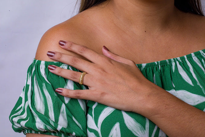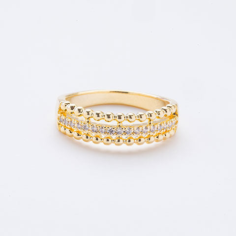 Anel com 1 fileira cravejada de zirconia no meio e duas fileiras de bolinhas, fino e elegante.