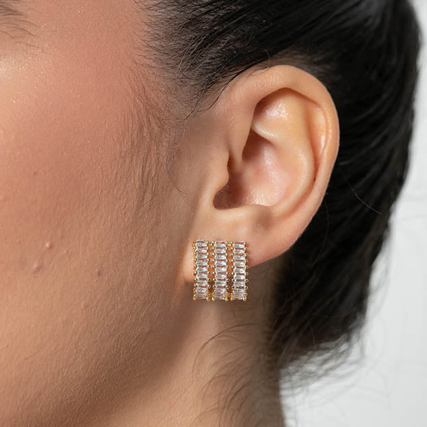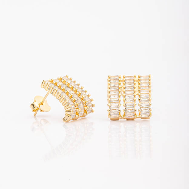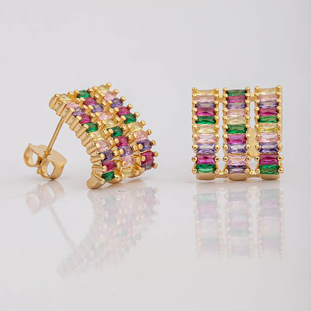 Brinquinho com 3 fileiras de zirconias navete, colorida ou cristal com folheado a ouro 18k e garantia de 1 ano no banho.