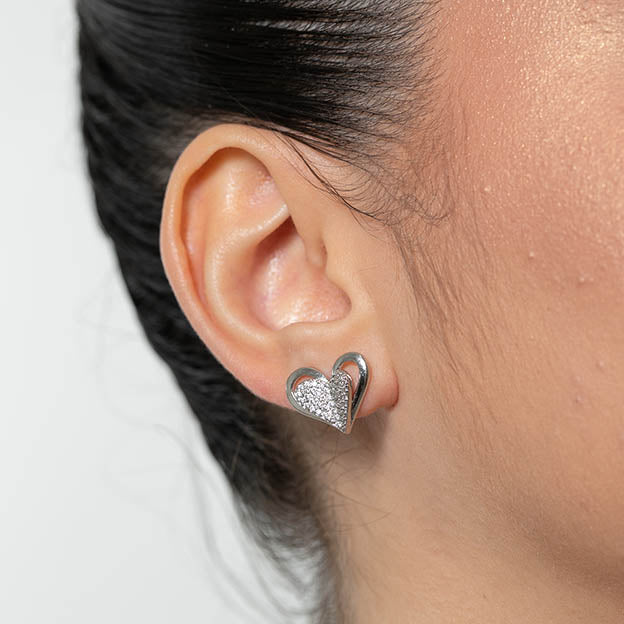 Brinco Coracao Duplo zirconia Cristal Prateado, Folheado no rodio com garantia no banho de 1 ano.