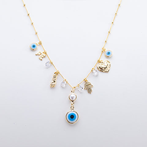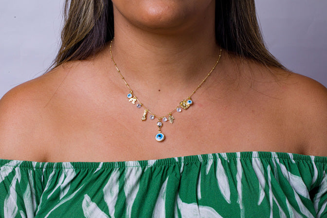 Colar com penduricalhos para sua sorte, com olho grego, figa, mão de fátima (hamsa), fé com corrente folheada a ouro 18 quilates.
