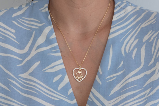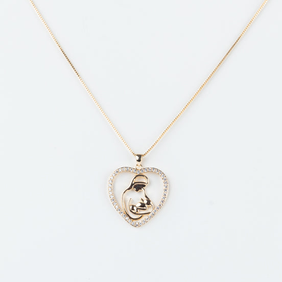 Colar com a imagem de uma mãe segurando o seu filho com zirconias em corrente e folheado a ouro 18 quilates.