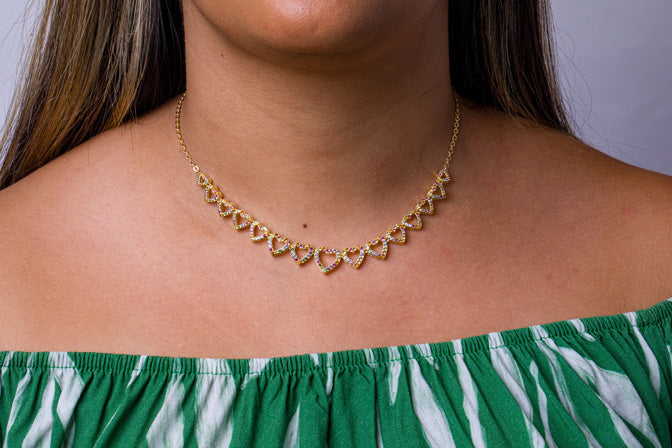 Lindo colar curtinho com varios coracoes cravejados de zirconias coloridas, muito charmoso, pode ser usada desde uma jovem até uma senhora, muito fino e elegante, corrente folheada a ouro 18 quilates.