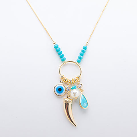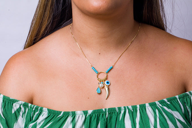 Colar com contas na cor turquesa com patuá contendo pingentes no formato de olho grego, perola, gota e dente banhado a ouro 18 quilates.