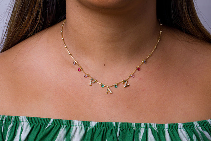 Colarzinho com o nome PAZ escrito com as letras separadas, com zirconias coloridas montado em corrente banhada a ouro 18 quilates.