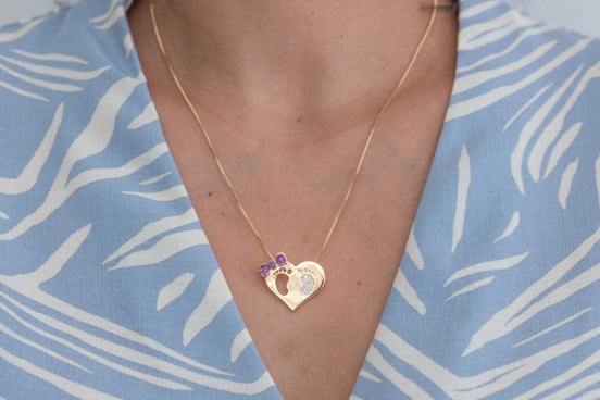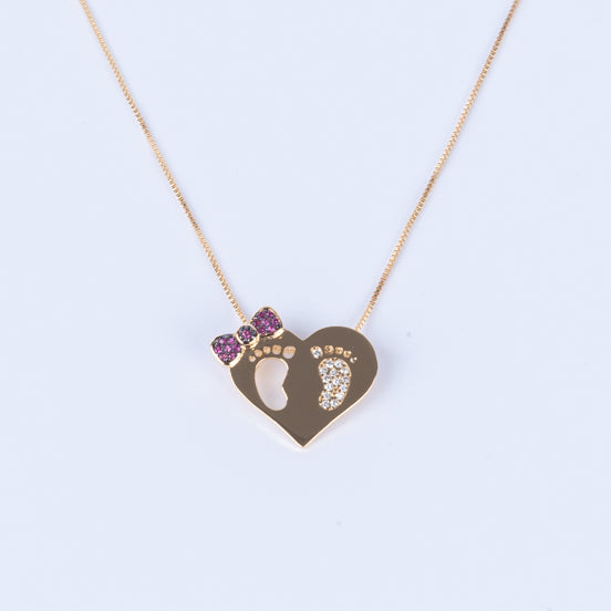 Lindo Colarzinho para homenagear mamães ou futuras mamãe de menina! com dois pés e um laço cravejado de zirconias rosas e dentro de um coração com corrente, banhado a ouro 18 quilates.