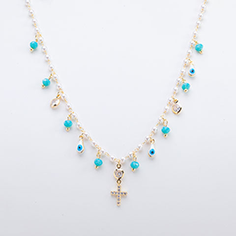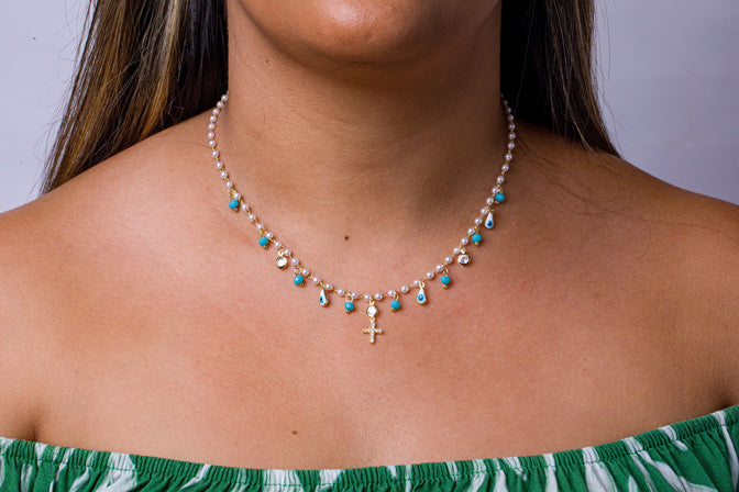 Lindo e delicado colar, finamente montado com pérolas, turquesas e cristais, com uma linda cruz cravejada de zirconias com uma corrente banhada a ouro 18 quilates.