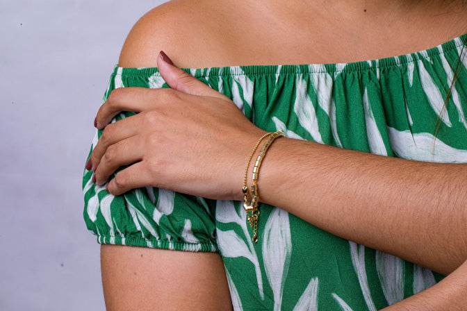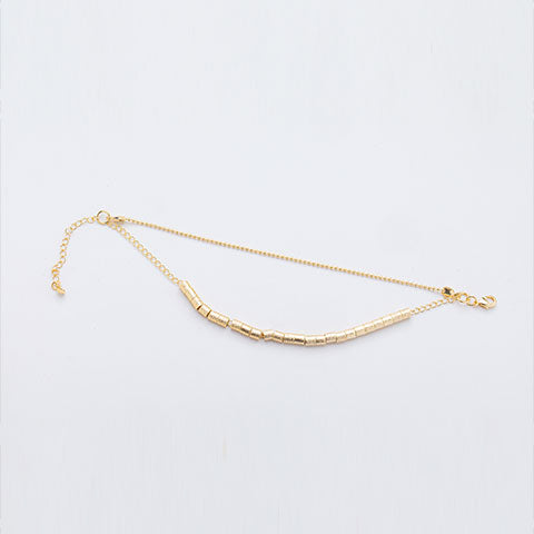 Pulseira com 2 voltas com várias pecinhas de metal e corrente completamente banhada a ouro 18 quilates.