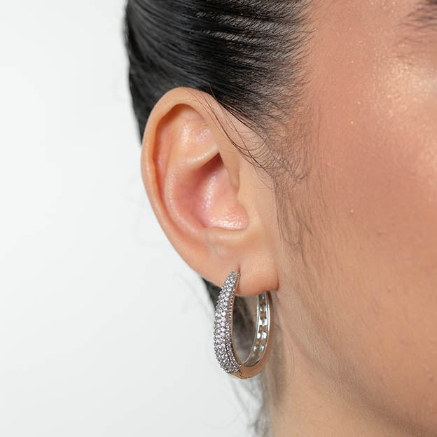 Argola média articulada alongada com zirconias e cravejada, folheada a rodio com garantia de 1 ano no banho.
