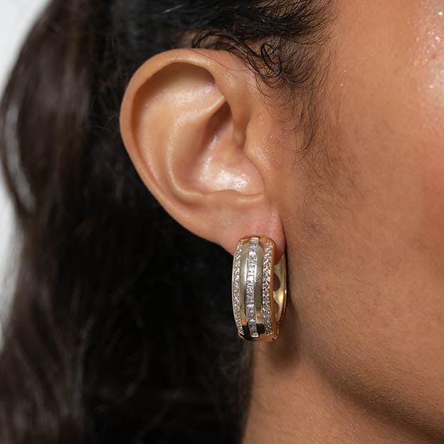 Argola com 3 fileiras de zirconia, folheada a ouro 18k, com garantia no banho de 1 ano.